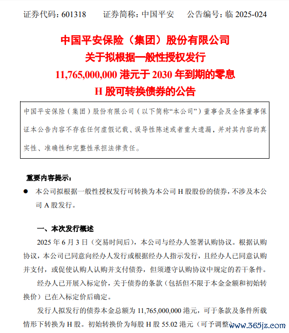 6月4日,中国平安发布公告称,拟根据一般性授权发行117.65亿港元于2030年到期的零息H股可转换债券,不涉及该公司A股发行。