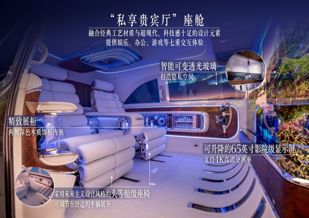 车内,智能可变透光玻璃分隔座舱,营造私密空间;水晶白色Nappa皮饰与胡桃木饰件搭配,格调高雅。头等舱级座椅调节模式丰富,可平躺展开。65英寸可升降影院级显示屏、7台投影仪及42个扬声器的杜比全景声音响系统,构建七重交互体验,让座舱能在多种功能间切换。奔驰计划2026年起基于该平台推出车型,且全新豪华纯电MPV将在福建奔驰投产。